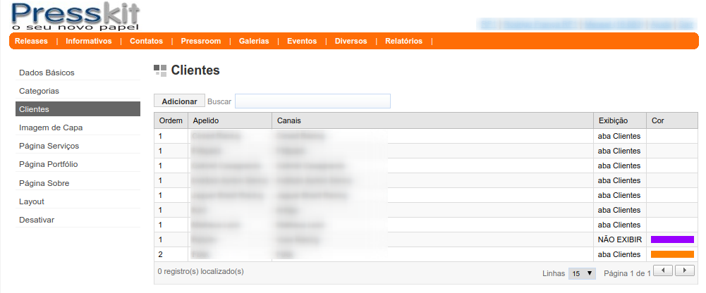 Os clientes podem ser posicionados de 4(quatro) diferentes formas na sala de imprensa, na aba de clientes como é o comportamente mais comum, também na aba portfólio se for um cliente que se tenha interesse em manter a exposição. Ainda podemos selecionar ambas as abas ou nenhuma delas.