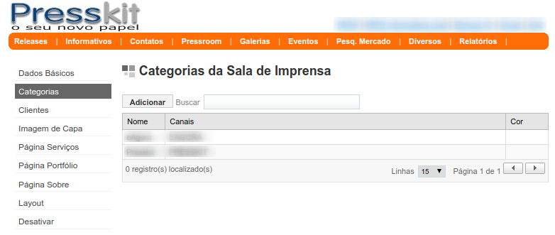 Podem ser criadas várias categorias e o funcionamento é semelhante ao recurso de clientes, porém no caso de categorias o agrupamento de canais pode conter o mesmo canal em diferentes categorias o que pode facilitar a forma como os releases são apresentados.