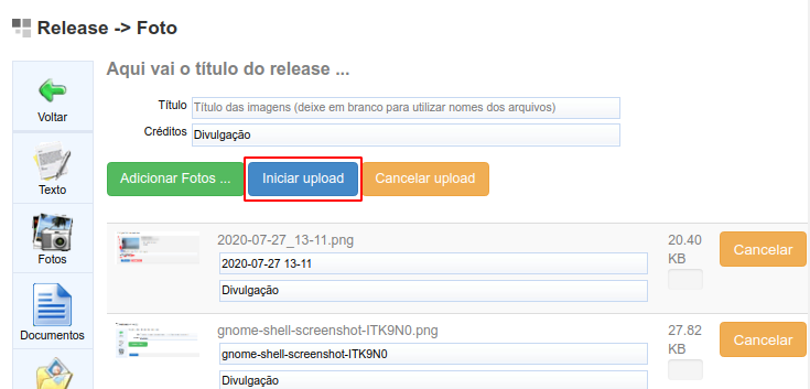 Depois de selecionar os arquivos, você ainda pode informar individualmente o título de cada foto e também os créditos e depois clicar em Iniciar Upload e Finalizar
