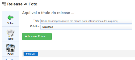 Para carregar as fotos em um release você precisa informar título e créditos, nessa primeira tela o que for informado nesses campos vai ser copiado pra todos os arquivos a serem carregados, se você quiser usar o nome dos arquivos das fotos como título deixe o campo em branco.