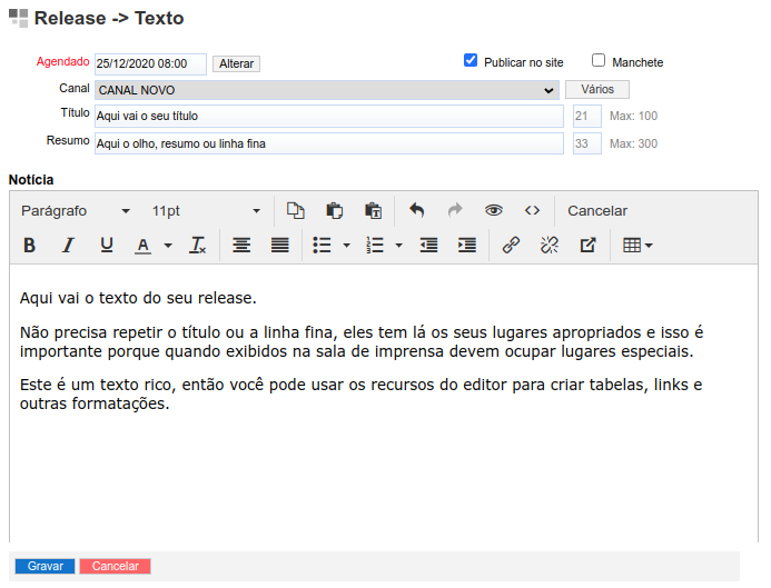 Canal : Pasta onde este release será armazenado, recomendamos sempre que seja criada uma pasta para cada cliente, assim na sala de imprensa será possível organizar os releases por clientes.
